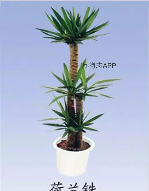 象脚丝兰又叫象脚玉兰,与凤尾兰同属于龙舌兰科的丝兰属,两者的形态特征也较为相似。象脚丝兰为常绿木本植物,在原产地株高可达10米,盆栽的株高多为l一2米。茎干粗壮、直立,褐色,有明显的叶痕,茎基部可膨大为近球状。叶窄披针形,着生于茎顶,末端急尖,长可达100厘米、宽约8—10厘米;叶革质,坚韧,全缘,绿色,无柄。