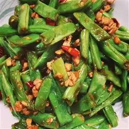 干煸四季豆是一道特色传统菜肴,属于川菜菜系,主要制作材料有四季豆、猪肉、红干辣椒等。干煸四季豆口味…