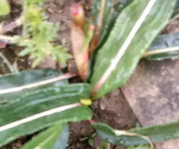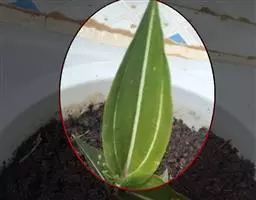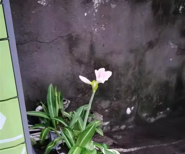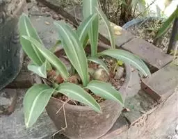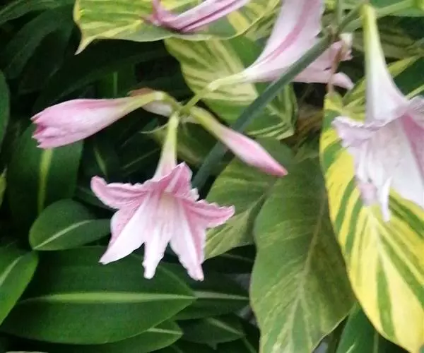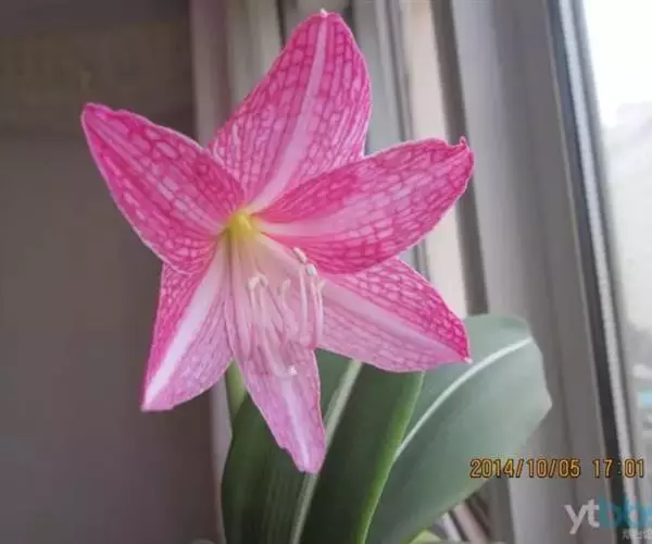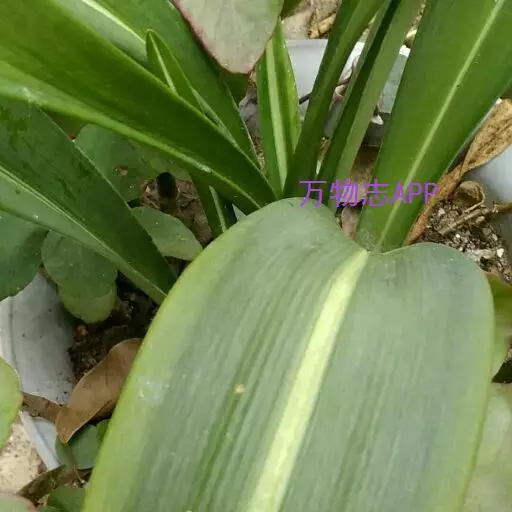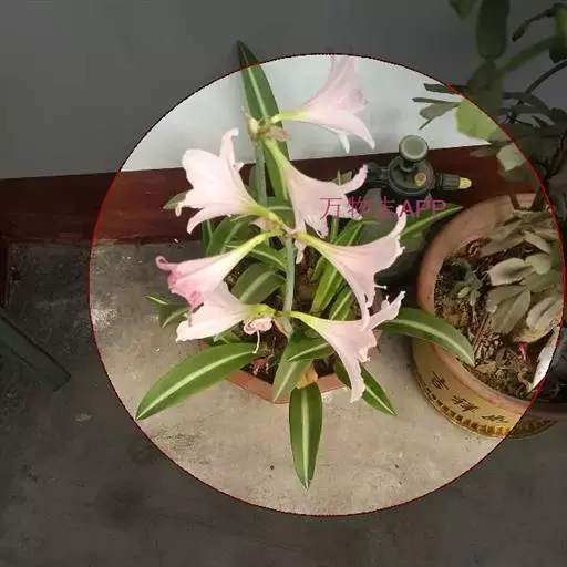 有肥大的鳞茎,近球形。叶片呈带状,与花茎同时或花后抽出。叶长约35厘米,宽约8厘米,翠绿色,叶片中央有一条宽1厘米左右的纵向白色锦斑,从叶基直至叶顶,花色大多为粉红色网纹状。