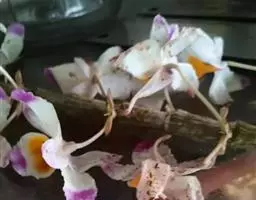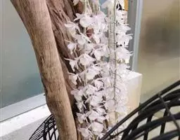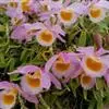 大苞鞘石斛(学名:Dendrobium wardianum Warner):茎斜立或下垂,肉质状肥厚,圆柱形不分枝,具多节;节间多少肿胀呈棒状。叶薄革质,二列,狭长圆形。总状花序从落了叶的老茎中部以上部分发出,具1-3朵花;花大,开展,白色带紫色先端;花瓣宽长圆形,与中萼片等长而较宽,达2.8厘米,先端钝,基部具短爪,具5条主脉和许多支脉;唇瓣白色带紫色先端,宽卵形。花期3-5月。