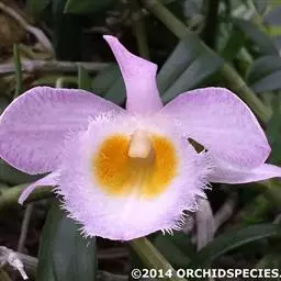 总状花序从落了叶的老茎中部以上部分发出,具1-3朵花;花序柄粗短,长2-5毫米,基部具3-4枚宽卵形的鞘;花苞片纸质,大型,宽卵形,长2-3厘米,宽1.5厘米,先端近圆形;花梗和子房白色带淡紫红色,长约5毫米;花大,开展,白色带紫色先端;中萼片长圆形,长4.5厘米,宽1.8厘米,先端钝,具8-9条主脉和许多近横生的支脉;侧萼片与中萼片近等大,先端钝,基部稍歪斜,具8-9条主脉和许多近横生的支脉;萼囊近球形,长约5毫米。
