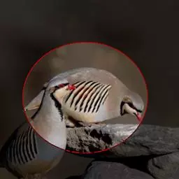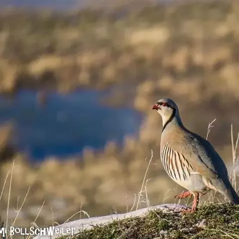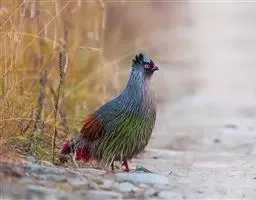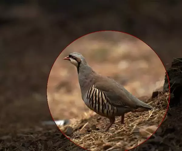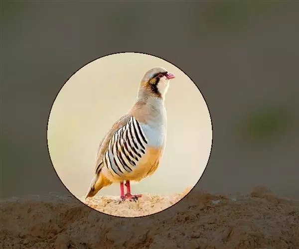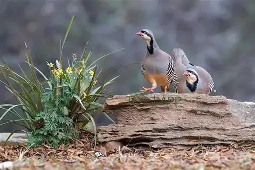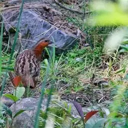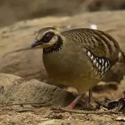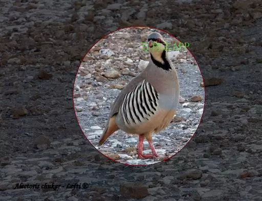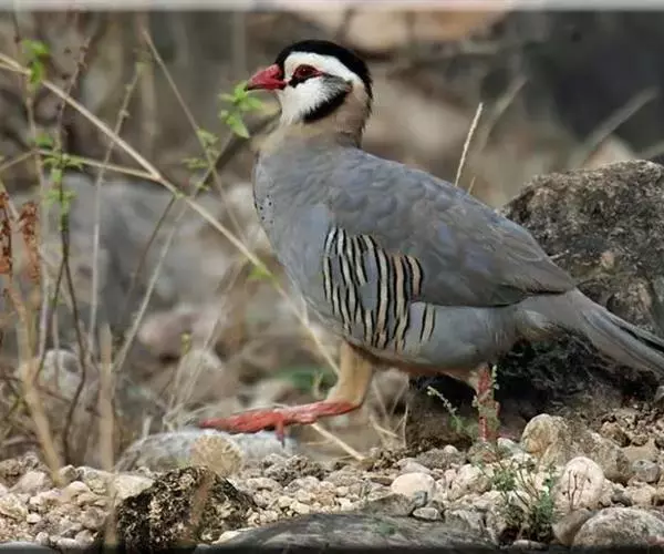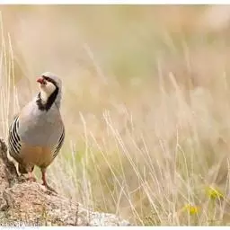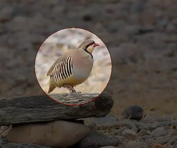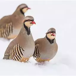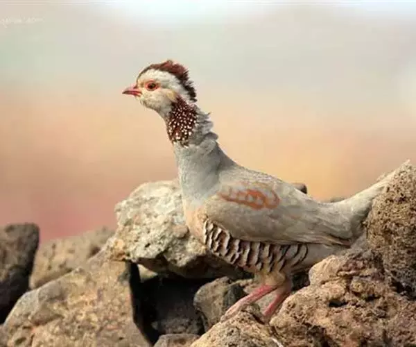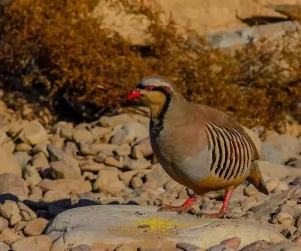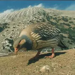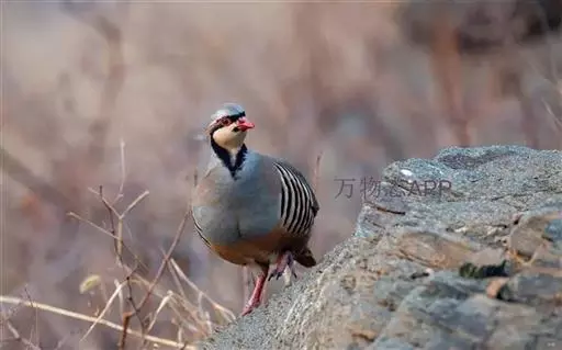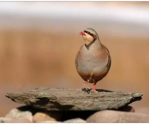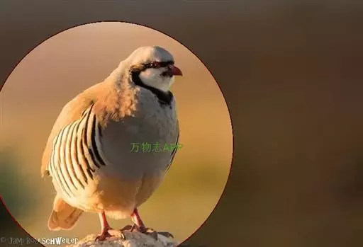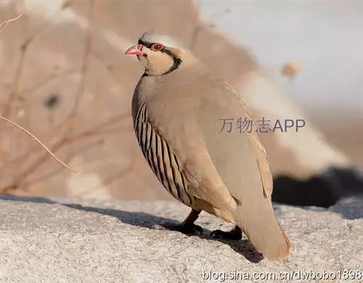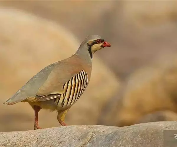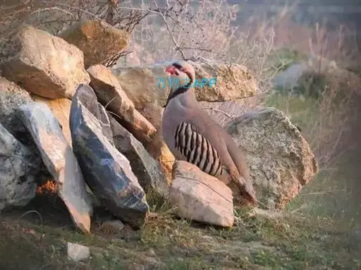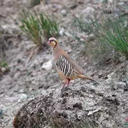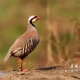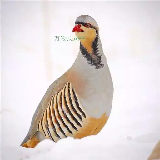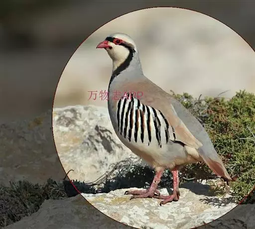石鸡(学名:Alectoris chukar):是中型雉类,共有14个亚种,体长27-37厘米,体重440-580克,比山鹑稍大一些。两胁具显著的黑色和栗色斑。第1枚初级飞羽介于第5和第6枚飞羽之间,或于第6枚初级飞羽等长;第3枚初级飞羽常是最长的。尾圆;尾长约为翅长的2/3;尾羽14枚。雄者具微小的瘤状距,嘴和足红色。雌雄在羽色上一样,仅在大小上有些不同。嘴、脚珊瑚红色。虹膜栗褐色。眼的上方有一条宽宽的白纹。围绕头侧和黄棕色的喉部有完整的黑色环带。上体紫棕褐色,胸部灰色,腹部棕黄色,两胁各具十余条黑、栗色并列的横斑。