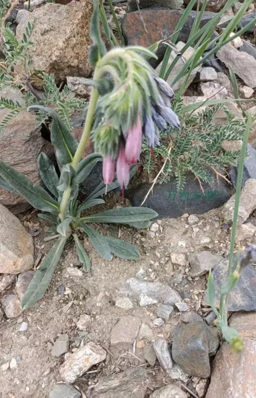 中文名:细花滇紫草 二年生草本,稀多年生,高40-80厘米,干后变黑。茎单一,不分枝,基部直径5-10毫米,上部叶腋生花枝,被伸展的硬毛及稠密的短伏毛,硬毛具基盘。基生叶丛生,线状披针形或倒披针形,长10-20厘米,宽1-2.5厘米,稀达3厘米,先端渐尖,基部渐狭成柄;茎中部及上部叶逐渐变小,披针形或卵状三角形,长3-7厘米,宽1-2厘米,先端渐尖,基部戟形,抱茎或稍抱茎。