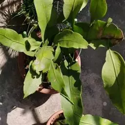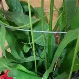 5. 令箭荷花茎节(叶片)扁平披针形,基部圆形,鲜绿色,边 缘略带红色,有粗锯齿,锯齿间凹入部有细刺,中脉明显突起。