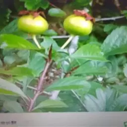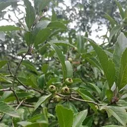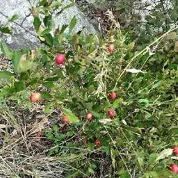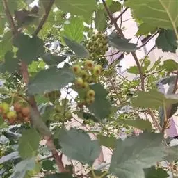 果实近球形或梨形,直径1-1.5厘米,深红色,有浅色斑点;小核3-5,外面稍具稜,内面两侧平滑;萼片脱落很迟,先端留一圆形深洼。花期5-6月,果期9-10月。