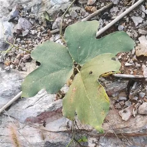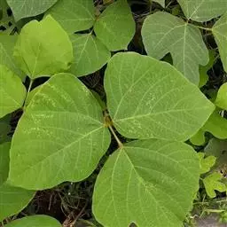多年生落叶藤本。根肥大。茎枝被黄褐色短毛或杂有长硬毛。三出复叶,具长柄;托叶披针状长椭圆形,有毛;顶生小叶片菱状卵形至宽卵形,有时3裂,长9-21厘米,宽8-18厘米,侧生叶片斜卵形,先端短渐尖,基部圆形或截形,全缘或具2-3裂片,两面均被黄粗伏毛。