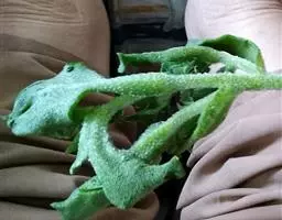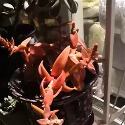 叶子表面宽厚,富肉质感且带有磨纱质感,看像石头质地;开红色小花,生于植株顶部,倒伞形密生,形状像花…