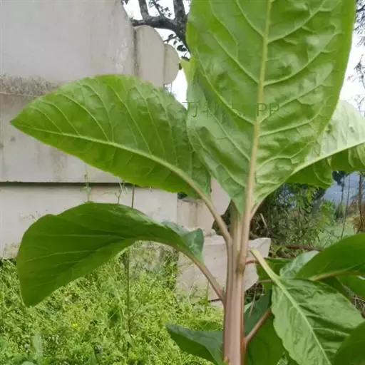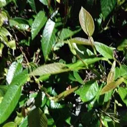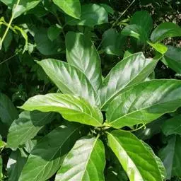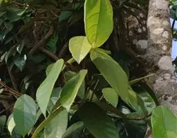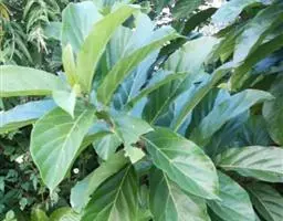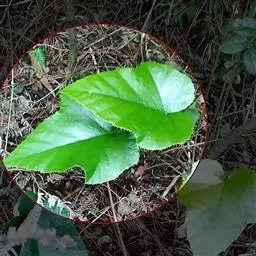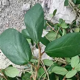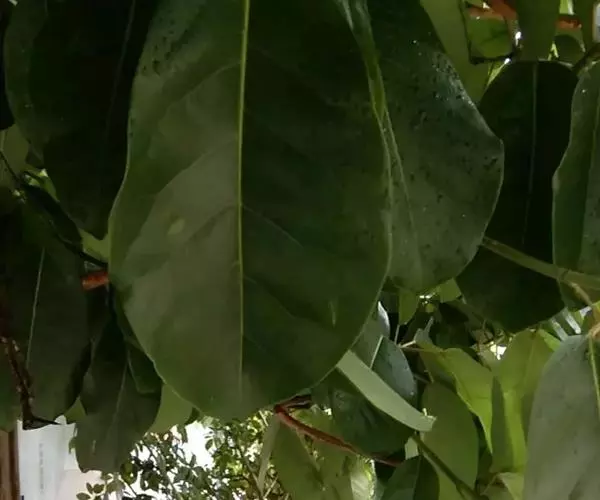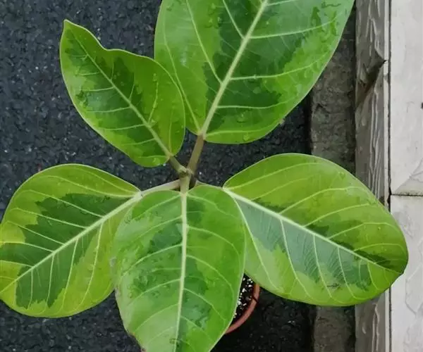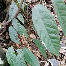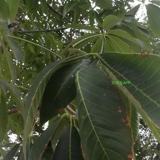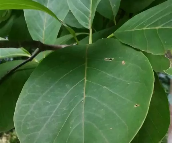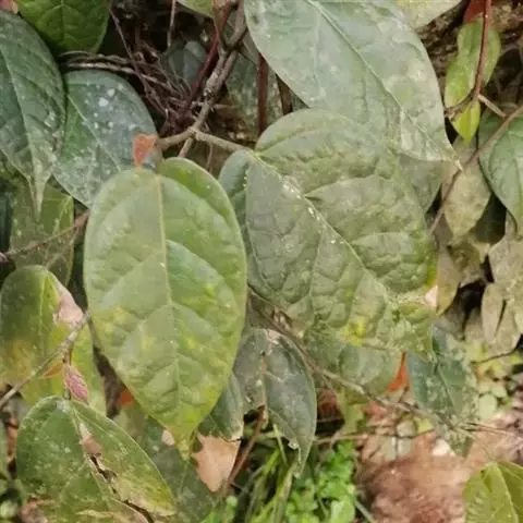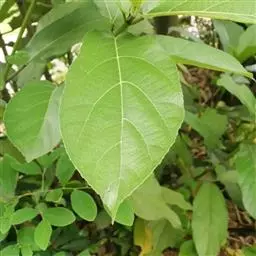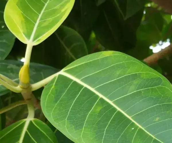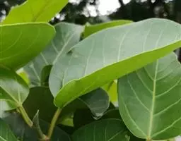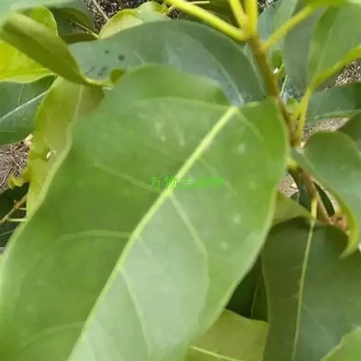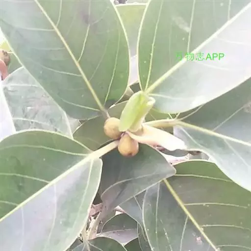 叶厚革质,广卵形至广卵状椭圆形,长10-19厘米,宽8-11厘米,先端钝,急尖,基部宽楔形,全缘,两面光滑,无毛,基生侧脉延长,侧脉5-7对;叶柄长2-5厘米,粗壮;托叶厚革质,长2-3厘米,外面被灰色绢丝状毛。