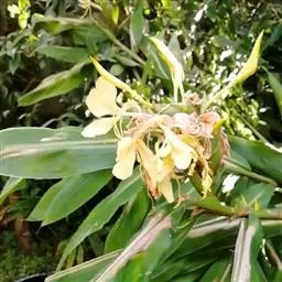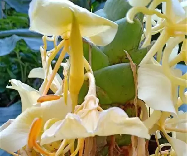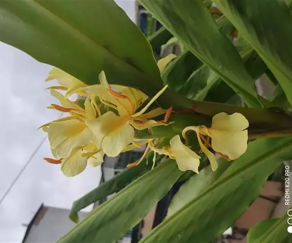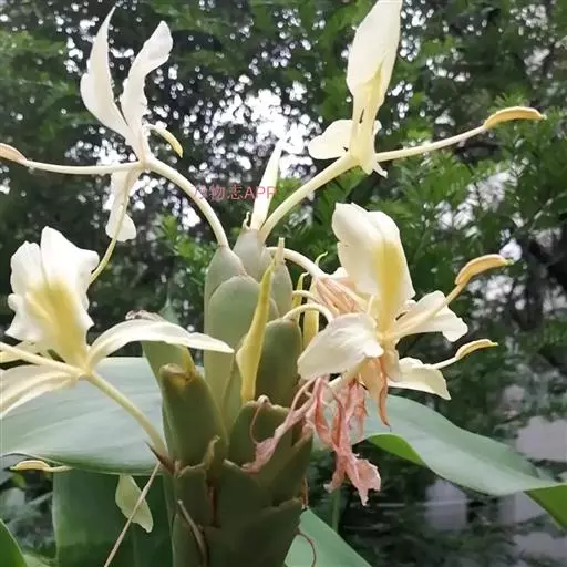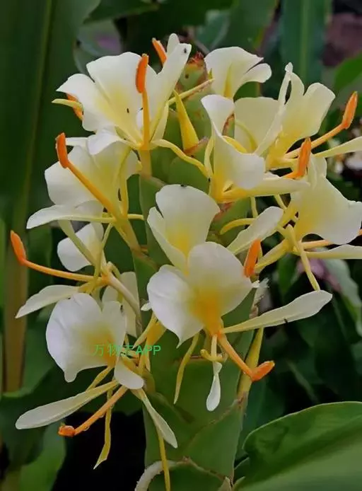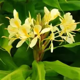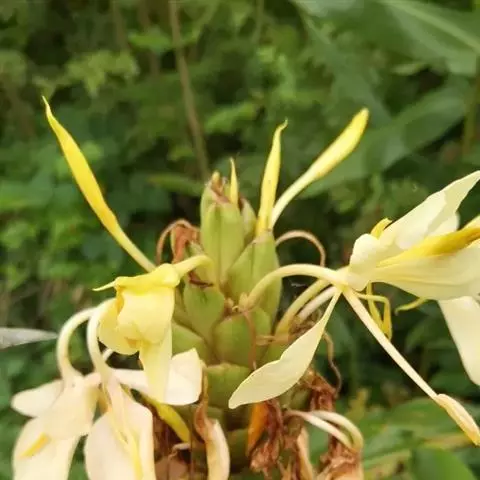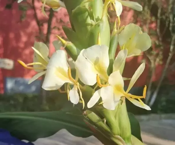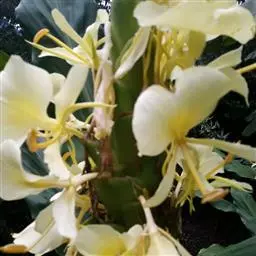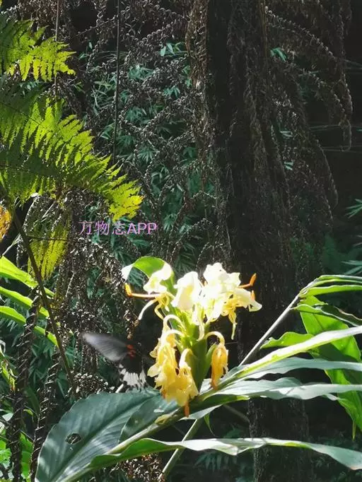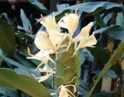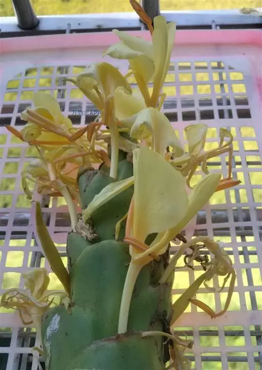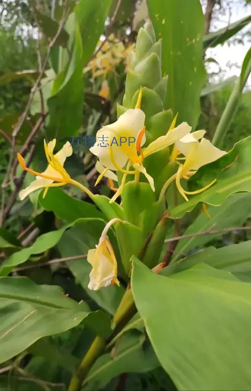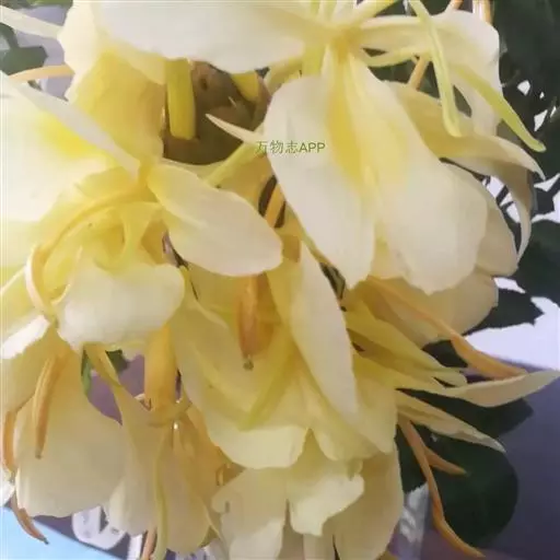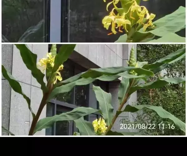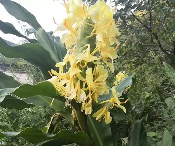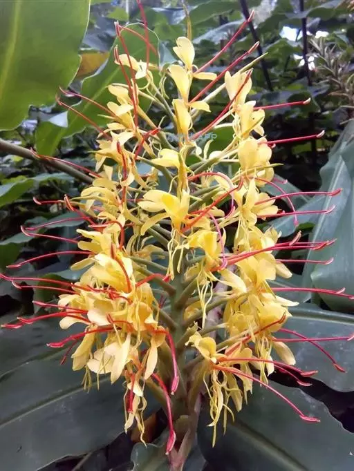 黄姜花(学名:Hedychium flavum Roxb.):姜科,姜花属多年生草本草本芳香花卉,秋冬季开花,穗状花序,长圆形;苞片长椭圆形,覆瓦状排列,每一苞片内有花3-5朵;花深黄色,形似蝴蝶,气味芬芳纯正,沁人心脾;唇瓣倒心形,黄色,当中有一个橙色的斑,顶端微凹,侧生退化雄蕊短瓣状;花朵由下至上依次开放,极为漂亮,自然栽培下,每个苞片可开花3-5朵,每支花期长约30天。