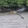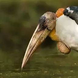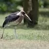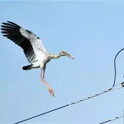 秃鹳(学名:Leptoptilos javanicus)是一种大而笨重的涉禽,体长110-135厘米,体重约10千克,站立时颈直起来,身高可达1.2米。嘴粗而长,脚亦甚长,上体黑灰色,具蓝黑色金属光泽。下体白色,头和颈具稀疏而短的毛发状羽近似裸露,红黄色。飞行时不像其他鹳那样颈向前伸直,而是头缩至肩上,主要通过两翅缓慢扇动、鼓翼飞行。平均每分钟153次。