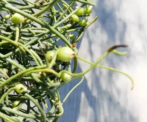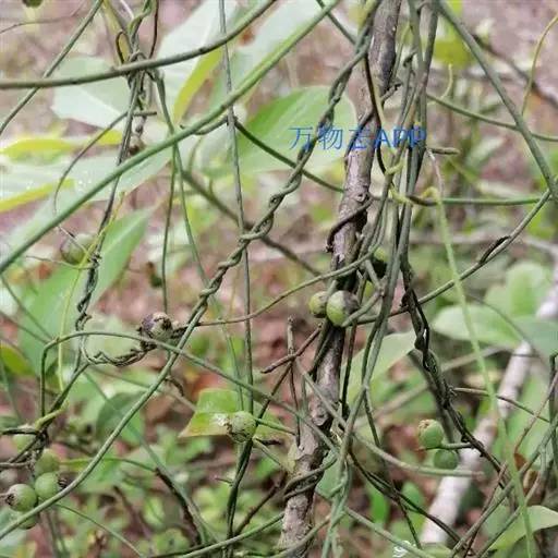 无根藤(学名:Cassytha filiformis L.)寄生缠绕草本植物,借盘状吸根攀附于寄主植物上。茎线形,稍木质,叶退化为微小的鳞片。穗状花序长2-5厘 米,花小,白色,长不及2毫米,无梗。花药2室,室外向。退化雄蕊3,位于最内轮,三角形,具柄。子房卵珠形,花柱短,略具棱,柱头小,头状。果小,卵球形。花、果期5-12月。