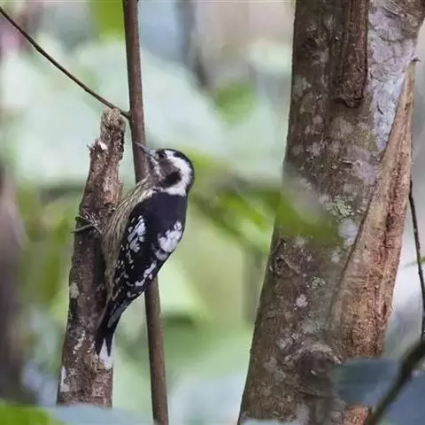 绒啄木鸟,北美洲最小的啄木鸟,白腹黑背和黑项,黑翼上有白色斑点。头部有黑白相间的条纹,尾巴短小,雄…