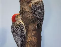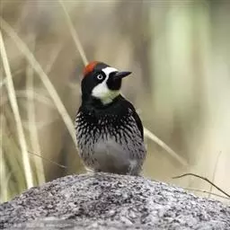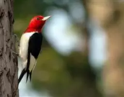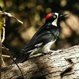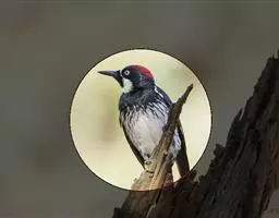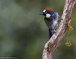 橡树啄木鸟:体长20-23厘米。前额灰黄色,头顶、后颈红色。喉下部、腰和腹部白色,…