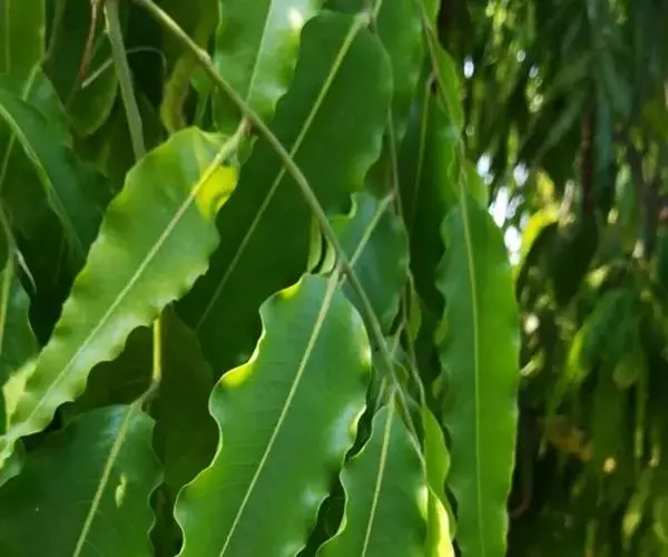 常绿乔木,树高达10-18米,树皮有丰富纤维,纵向剥落。侧枝纤细下垂,枝叶浓密,从地面到顶端能长年保持完整的枝叶,树冠尖塔状。单叶互生,嫩叶初时铜褐色,后渐变为深绿色;叶长披针形,边缘波浪状,长12-27厘米,宽2-6厘米,下垂;叶背面侧脉突起;叶正面侧脉略突,叶柄长0.7-1厘米。