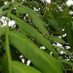 叶长约15-30厘米,叶总柄显著短于叶轴,叶总柄及叶轴初时被稀疏的褐色短柔毛,后来脱落而近无毛,具7-23枚小叶;小叶纸质,侧生小叶无叶柄,对生或生于下端者偶尔有互生,卵状披针形至长椭圆状披针形,长4-11厘米,宽1.5-3.5厘米,不等边,上方一侧较下方一侧为阔,基部歪斜,顶端长渐尖,边缘有锯齿,顶生小叶具长约2-3厘米的小叶柄,基部对称,圆形或阔楔形,小叶上面绿色,近无毛或脉上有褐色短柔毛,下面浅绿色,初时脉上有褐色柔毛,后来脱落,或在侧脉腋内、在基部两侧毛不脱落,甚或毛全不脱落,毛的疏密依不同个体及生境而变异较大。