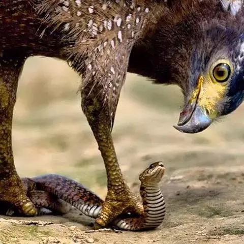 角雕长有尖利的钩状喙,强壮的爪子几乎和人的手掌一样大,是所有猛禽中绝无仅有的。尖锐的指甲长达12厘米,腿部肌肉十分发达,抓力达到50公斤,能轻而易举的捏碎猎物的头盖骨,刺穿很厚的铁板。