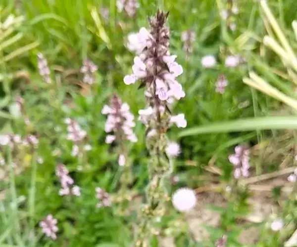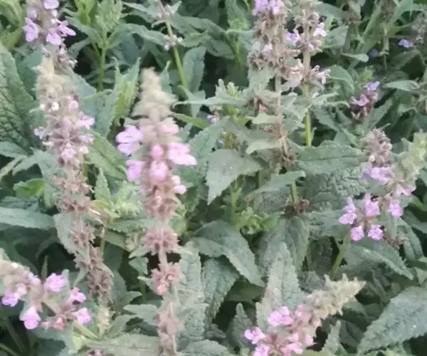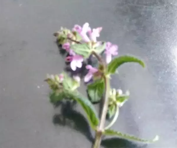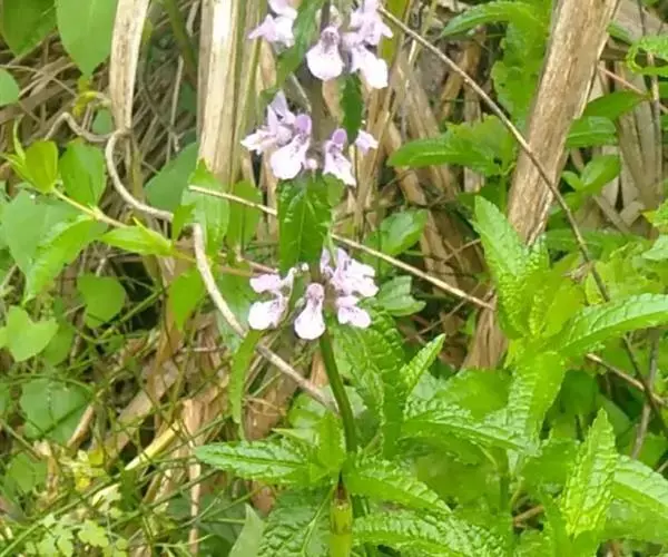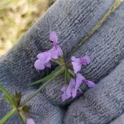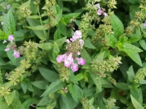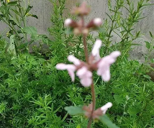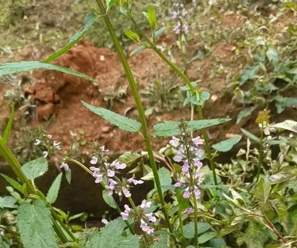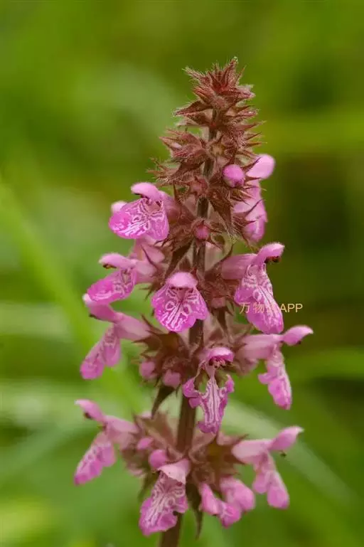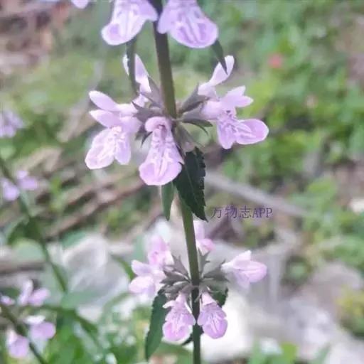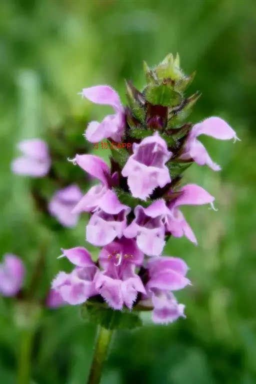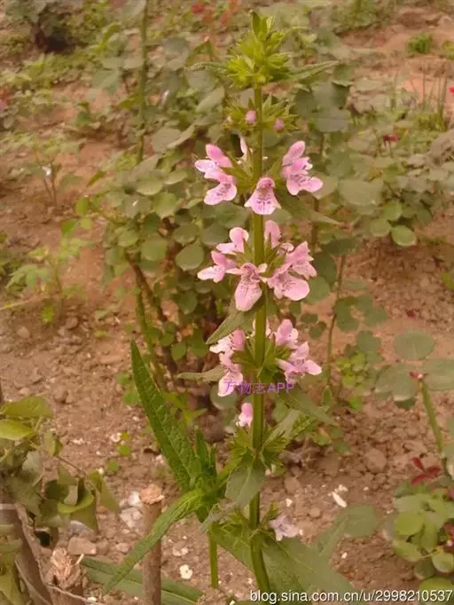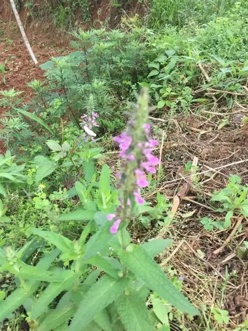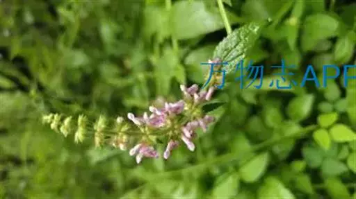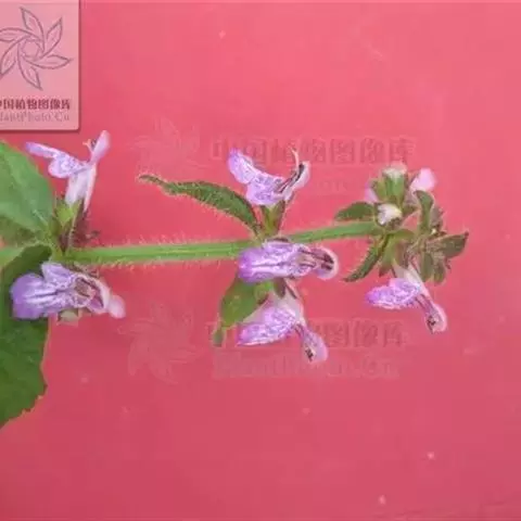 花:轮伞花序6-8花,下部者远离,上部者密集组成长5-13厘米的穗状花序;小苞片刺状,微小,长约1毫米,无毛;花梗短,长约1毫米,疏被微柔毛。花萼钟形,连齿长达7.5毫米,外被具腺微柔毛,肋上杂有疏柔毛,稀毛贴生或近于无毛,内面在齿上疏被微柔毛,余部无毛,10脉,不明显,齿5,等大,三角状披针形,先端具刺尖头,边缘具缘毛。花冠粉红或淡红紫色,长约1.2厘米,冠筒长约6毫米,几不超出于萼,外面无毛,内面在近基部1/3处有微柔毛毛环及在下唇下方喉部有鳞片状微柔毛,前面紧接在毛环上方呈囊状膨大,冠檐二唇形,上唇直立,倒卵圆形,长4毫米,宽2.5毫米,外面被微柔毛,内面无毛,下唇开张,长7毫米,宽6毫米,外面疏被微柔毛,内面无毛,3裂,中裂片最大,近圆形,先端微缺,侧裂片卵圆形。雄蕊4,均延伸至上唇片之下,花丝丝状,先端略增大,被微柔毛,花药卵圆形,2室,室极叉开。花柱丝状,稍超出雄蕊,先端相等2浅裂。花盘平顶。子房黑褐色,无毛。