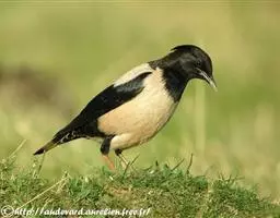 粉红椋鸟:中等体型,成鸟体长19-22厘米,体重60-73克,飞羽、尾羽为亮黑色,雌鸟与雄鸟毛色相似,…