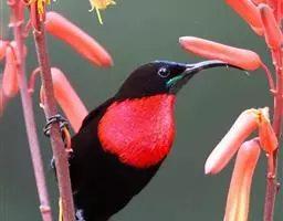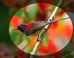 黑胸太阳鸟:小型鸟类,体长9-15厘米。嘴细长而向下曲。雄鸟中央尾羽特长,尾呈楔形,…