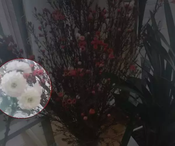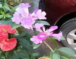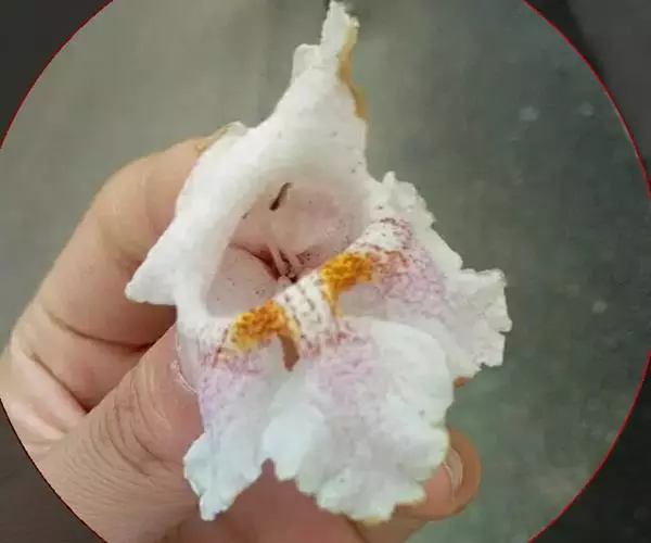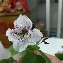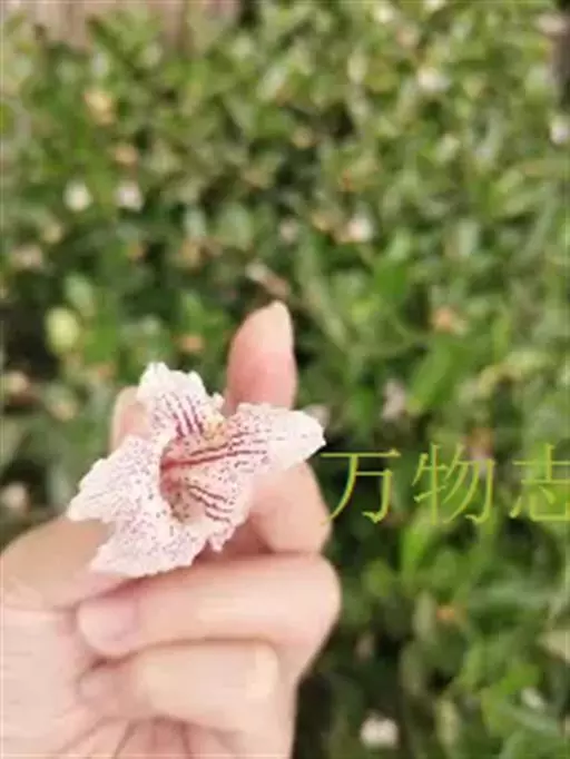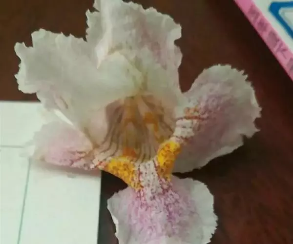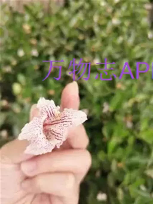 顶生伞房状总状花序,有花7-15朵。花萼2裂近基部,裂片卵圆形。花冠淡红色至淡紫色,内面具紫色斑点,钟状,长约3.2厘米。雄蕊2,内藏,退化雄蕊3枚,花丝着生于花冠基部,花药广歧,长3-4毫米。花柱丝形,细长,长约2.5厘米,柱头2裂;子房2室,胚珠多数。