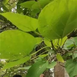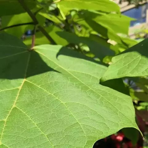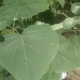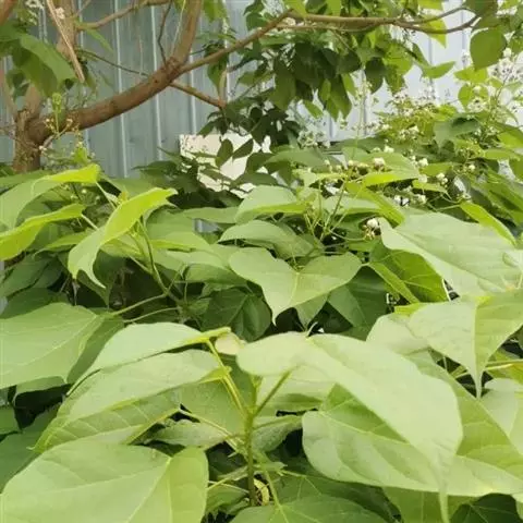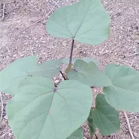 叶厚纸质,卵形或三角状心形,长13-20厘米,宽10-13厘米,顶端渐尖,基部截形或微心形,侧脉4-5对,基部有3出脉,叶幼时表面微有分枝毛,背面较密,以后变无毛;叶柄长3-10厘米。