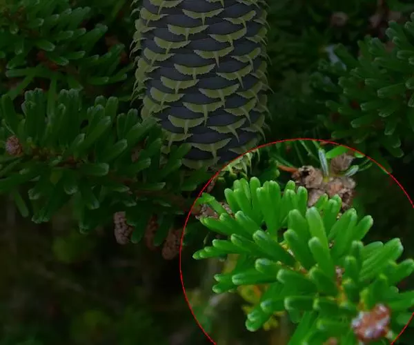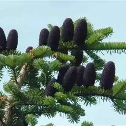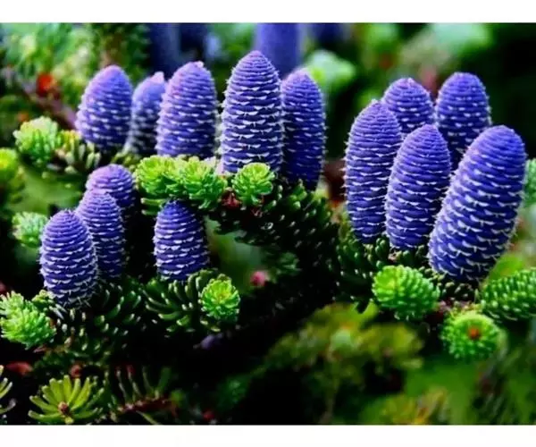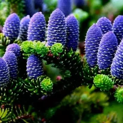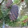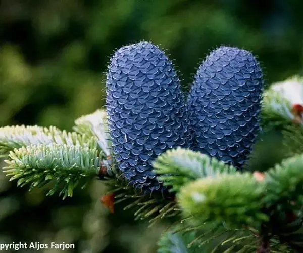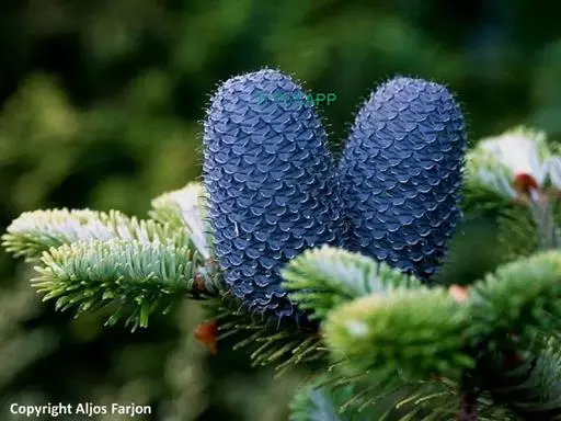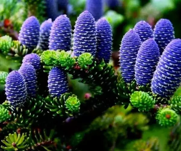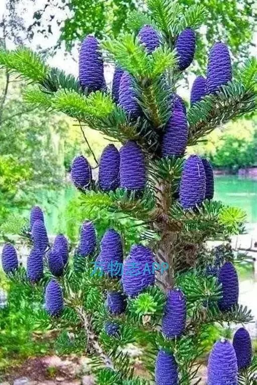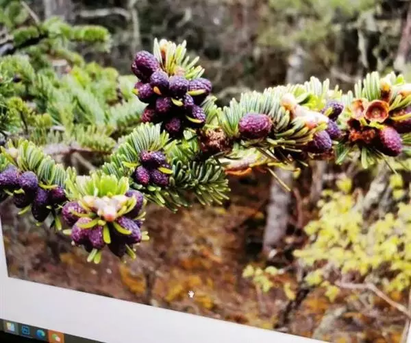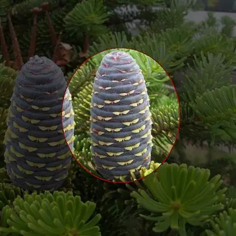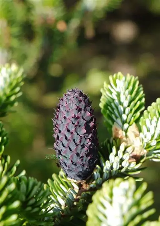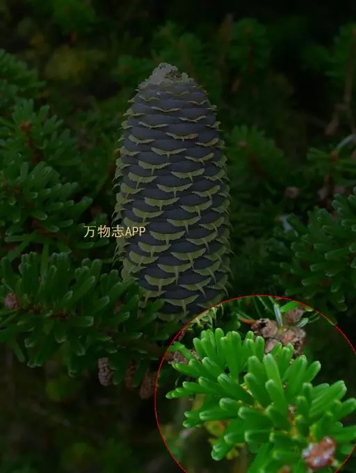 球果柱状矩圆形或圆柱形,长5-8厘米,径3-4厘米,成熟时淡紫色、紫黑色或红褐色;中部种鳞肾形或扇状肾形,长0.8-1.2厘米,宽1.5-2厘米,上部宽厚,边缘内曲;苞鳞倒卵状楔形,上部圆,边缘有细缺齿,先端有急尖的短尖头,尖头露出或微露出;种子倒三角状卵圆形,种翅楔形,较种子为短或等长。