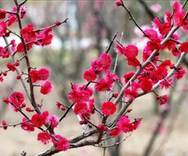 朱砂梅耐寒性稍差,繁殖亦较难,属中晚梅,花期2月底-3月初。
