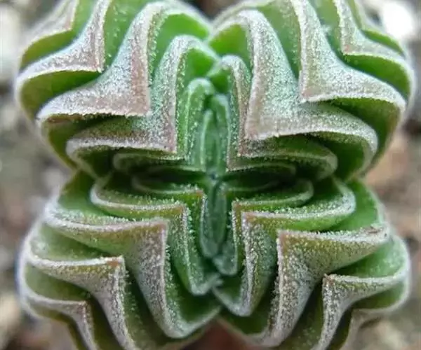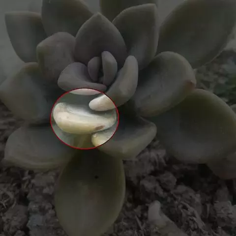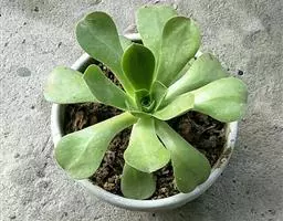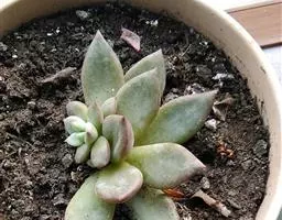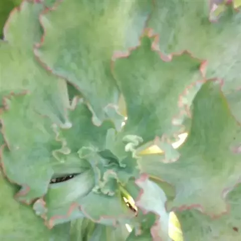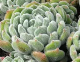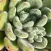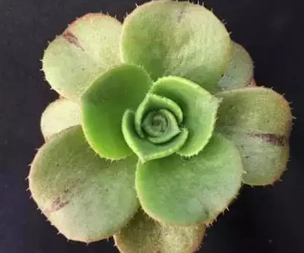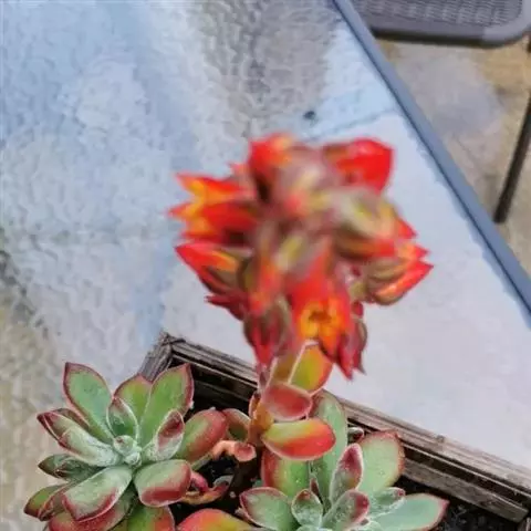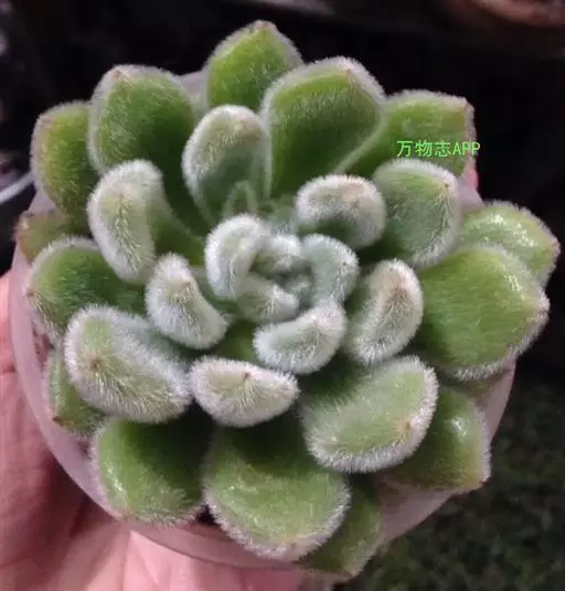 莲座叶盘无茎,老株易丛生。大的莲座叶盘由100片以上的叶组成。叶长5—7厘米、宽2厘米,基部狭窄,先端卵形并较厚,叶正面微凹、背面圆突,叶先端有微小的钝尖。叶绿色,叶端微呈红褐色,全叶被0.3厘米长的白毛。花序高20—30厘米,小花多,黄红色。本种形态有点像一种普遍栽培的同科属种类锦晃星,不同的是它没有高的茎,叶片比锦晃星厚,叶缘也没有锦晃星红。