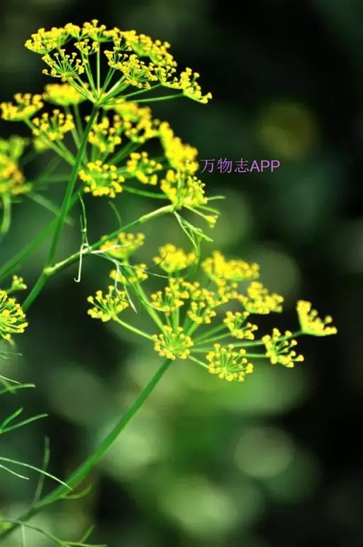 多年或一年生草本,高60-90厘米;茎直立,无毛。 莳萝 叶矩圆形至倒卵形,长10-35厘米,二至三回羽状全裂,最终裂片丝状。复伞形花序顶生,直径约15厘米;无总苞及小苞;花瓣黄色,内曲,早落。双悬果椭圆形,背棱稍突起,侧棱狭扁带状。