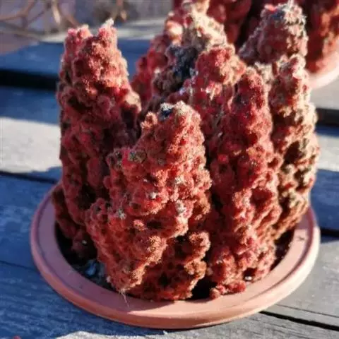 叶子表面宽厚,富肉质感且带有磨纱质感,看像石头质地;开红色小花,生于植株顶部,倒伞形密生,形状像花…