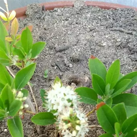 常绿小灌木,茎平卧或斜升,多分枝,地面上直立枝条高10-30(-40)厘米,当年生枝黄褐色或紫褐色,无毛。叶互生,密集,近无柄,革质,条形,长(5-)7(-14)毫米,宽约1-2毫米,顶端钝,基部近截形或宽楔形,边缘有尖而小的细锯齿,常外卷,两面深绿色,光滑,上面中脉明显,下面中脉凹陷。