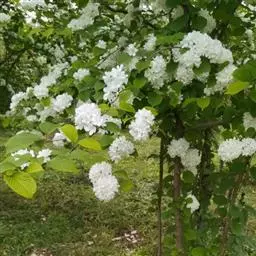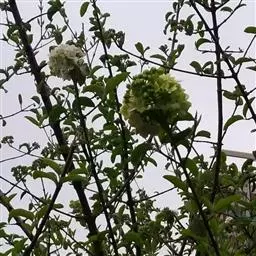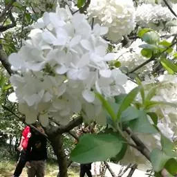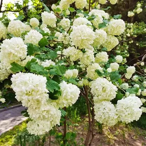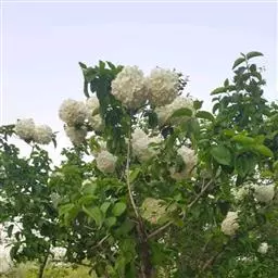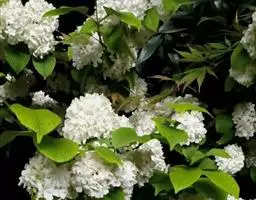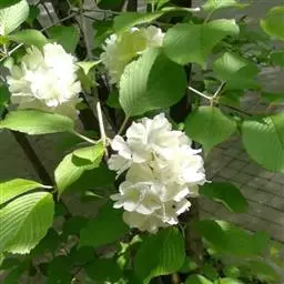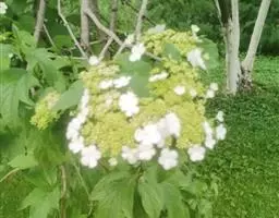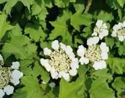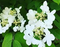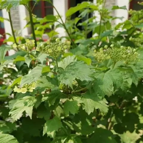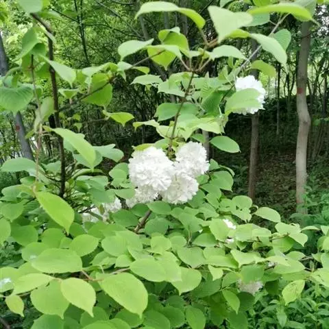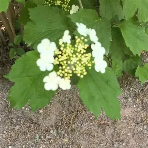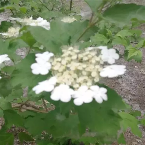 聚伞花序直径5~9厘米,花开后几无毛,周围有大型、白色的不孕花,无总花梗,第一级辐射枝常5条,花生于第三级辐射枝上,芳香;萼筒近圆球形,长约2毫米,萼齿卵圆形;花冠白色或带微红,辐状,直径5~6毫米,裂片卵形,长二倍于筒;雄蕊花药宽卵圆形,黄色;花柱不高出萼齿;不孕花直径2.5~3厘米,裂片倒卵形,常大小不等。