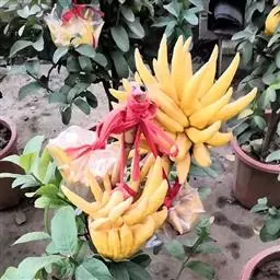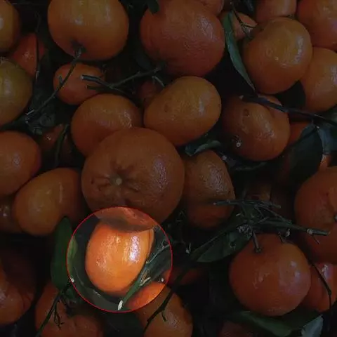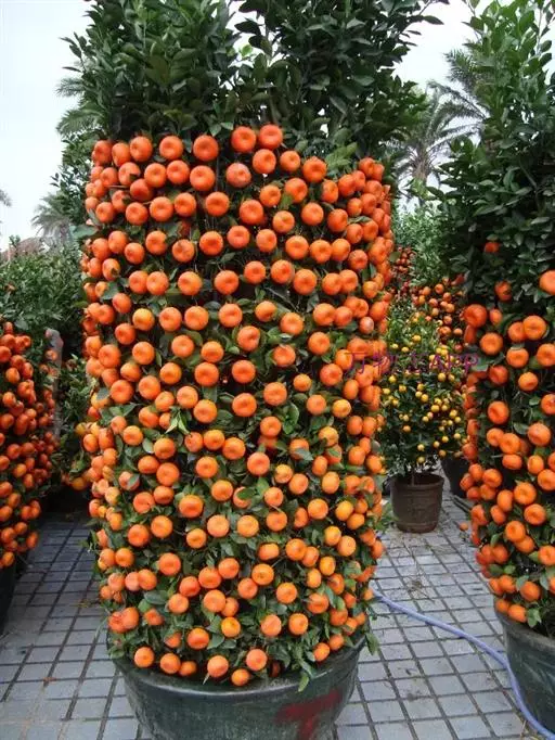 幼果绿色,10~12月成熟后变成朱红色,果实比四季桔大。果形扁圆形,果顶有小脐、凹入。果表面粗糙,油胞大而突出或细密凹入,果皮松软、易剥离。果肉囊瓣肾形,9~10瓣,汁泡较大,果心空。果肉可食用,味甜带酸、柔软化渣,有异味。