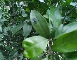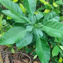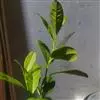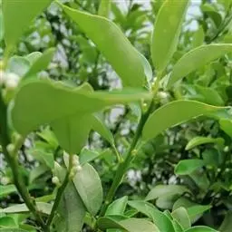 叶片椭圆形,长约4.6~6.7厘米,宽约2.1~3.6厘米,长是宽的约1.8~2.2倍。翼叶细小,叶柄短,叶脉不明显。叶缘浅波状或全缘,叶尖钝或微尖凹。新叶淡绿色,老叶深绿色。