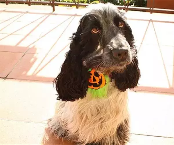 2、英国可卡犬脸部比较宽阔,前额平坦,额段明显,鼻部肥大而宽阔,眼睛较大而明亮,两眼距离较大,眼鼻皆为深色。