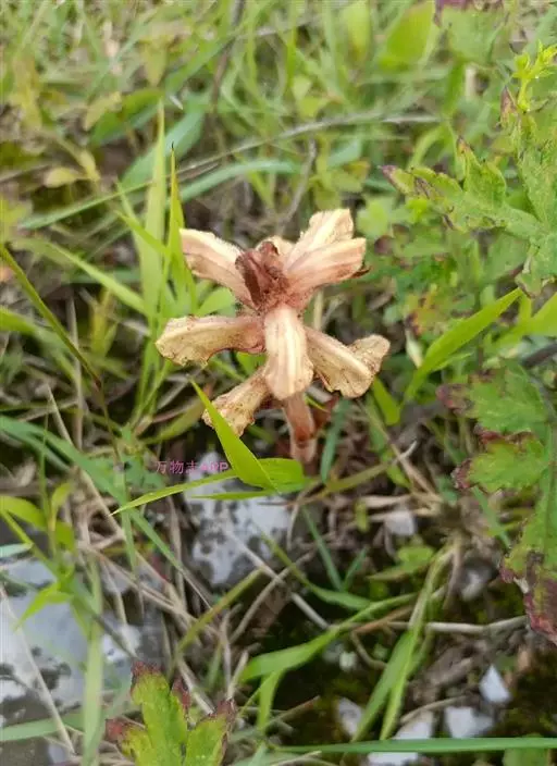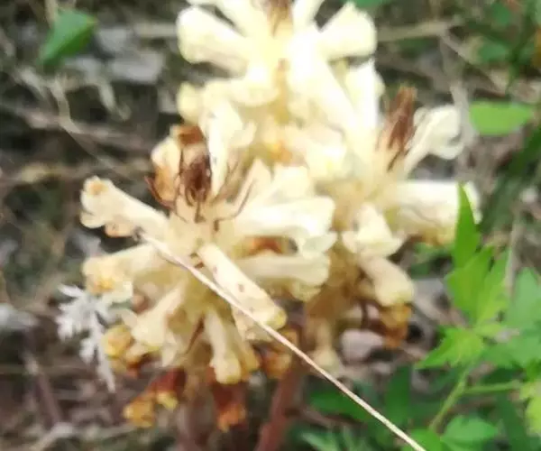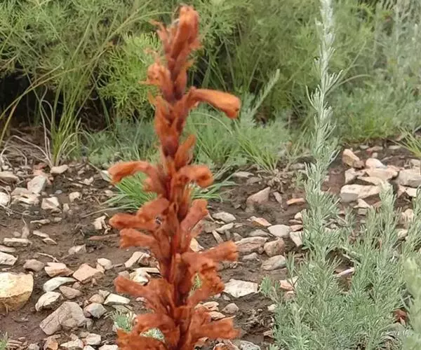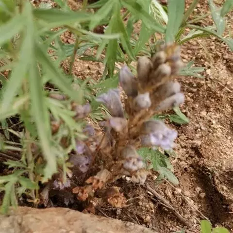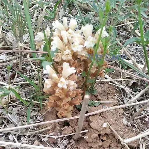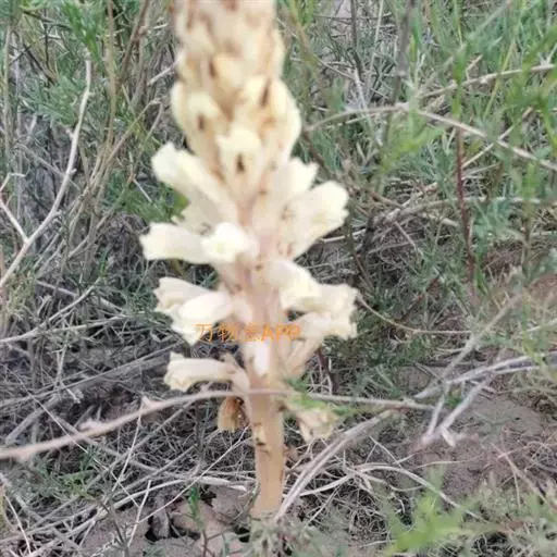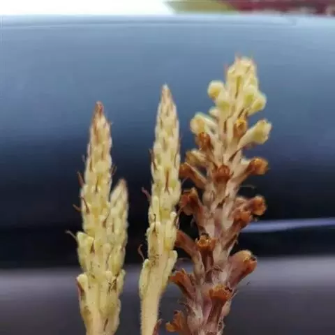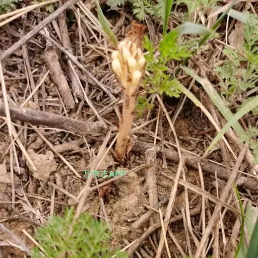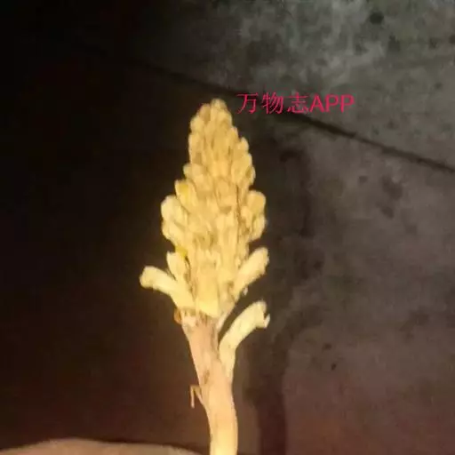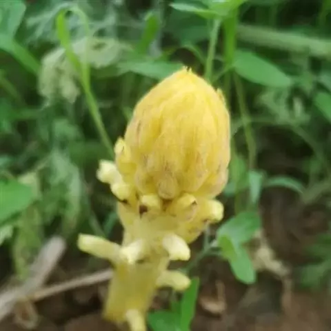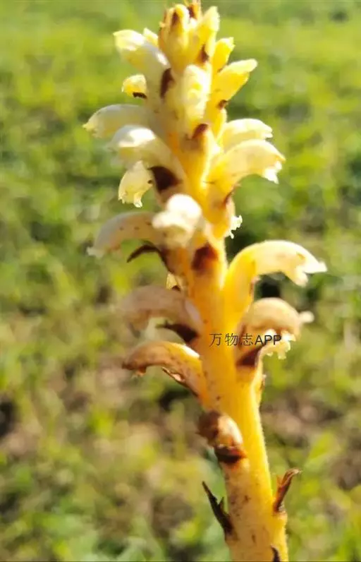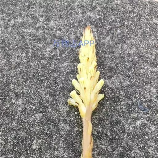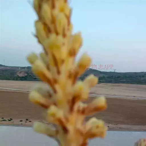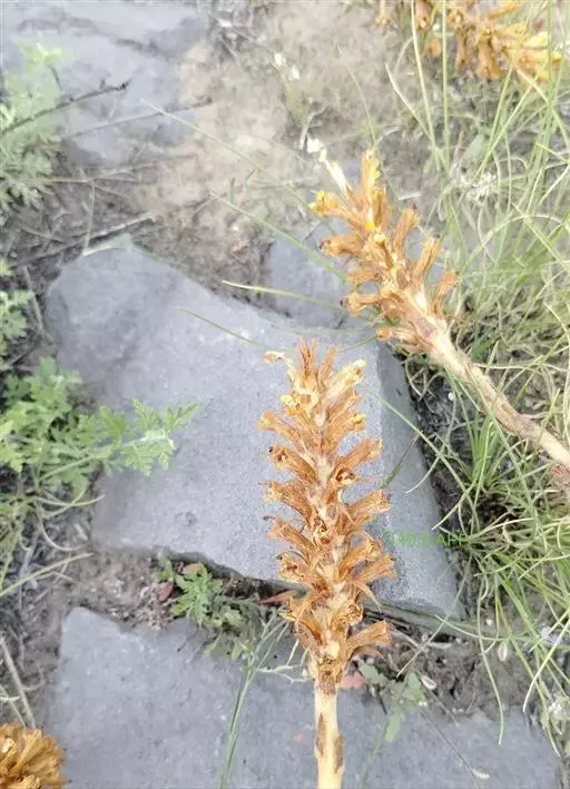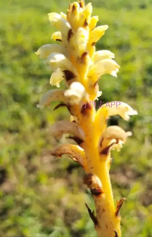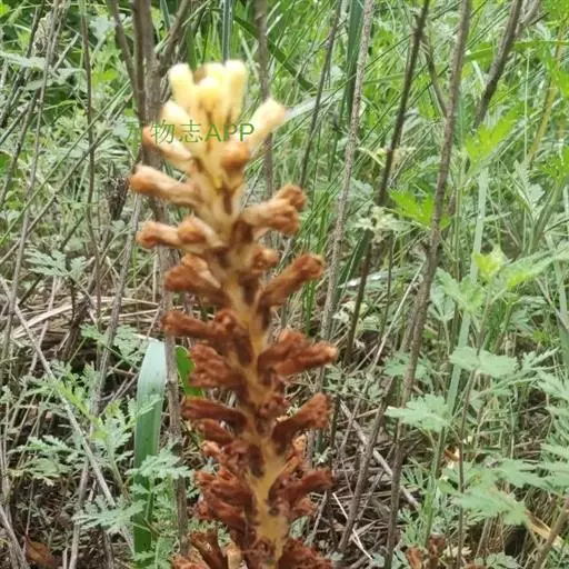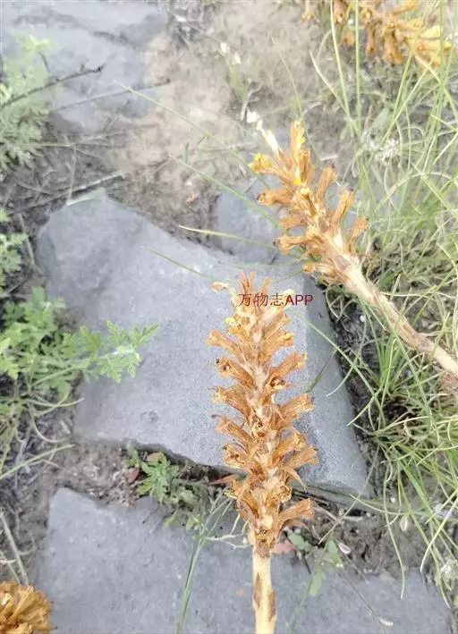 【特征】: 一年生寄生草本。株高10-34厘米,植株密被腺毛。茎直立,常不分枝,圆柱形,基部常膨大,黄褐色。叶为鳞片状、卵状披针形。