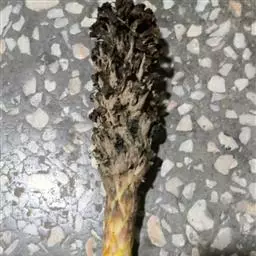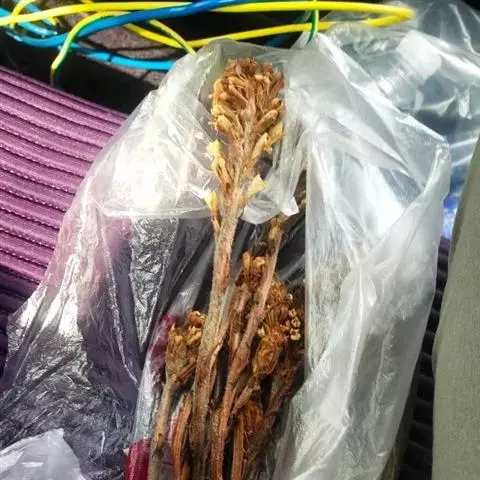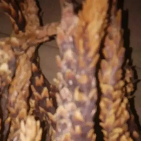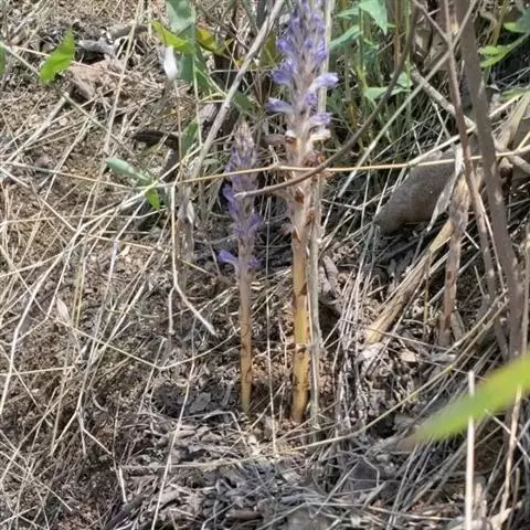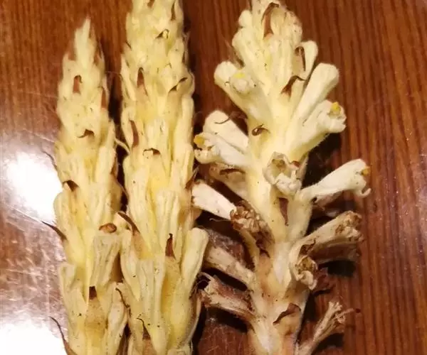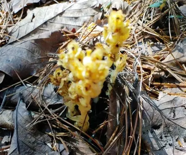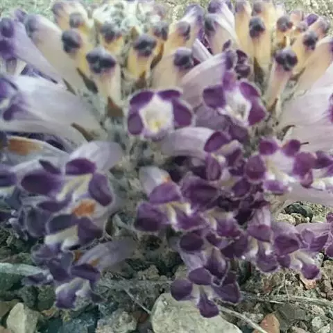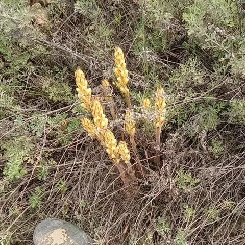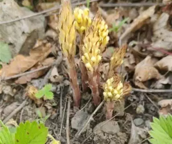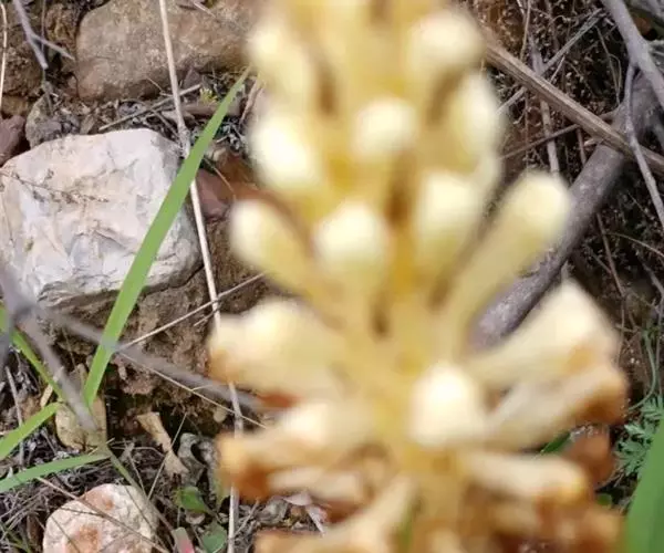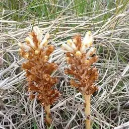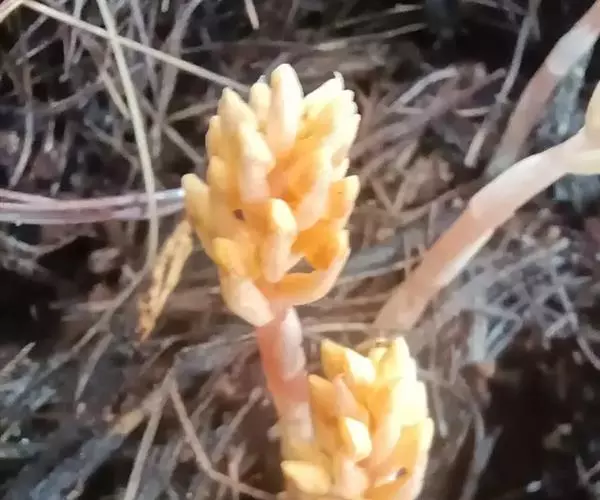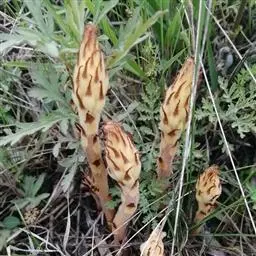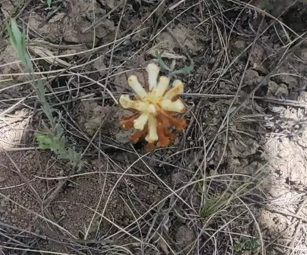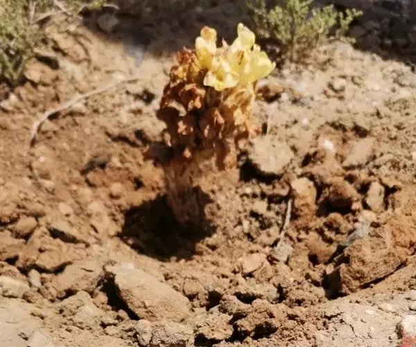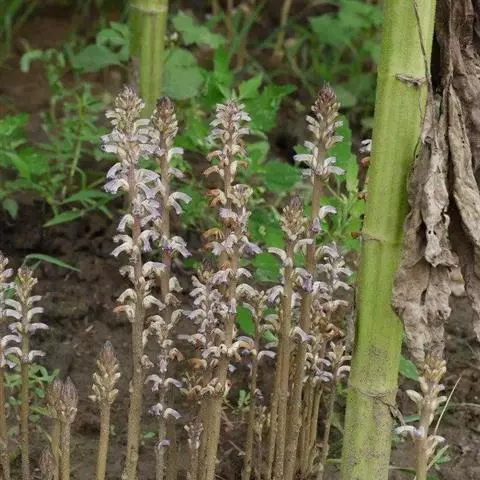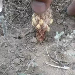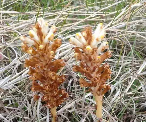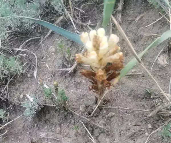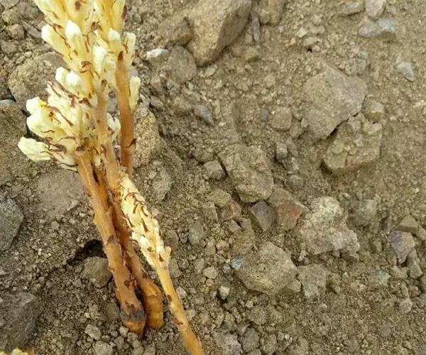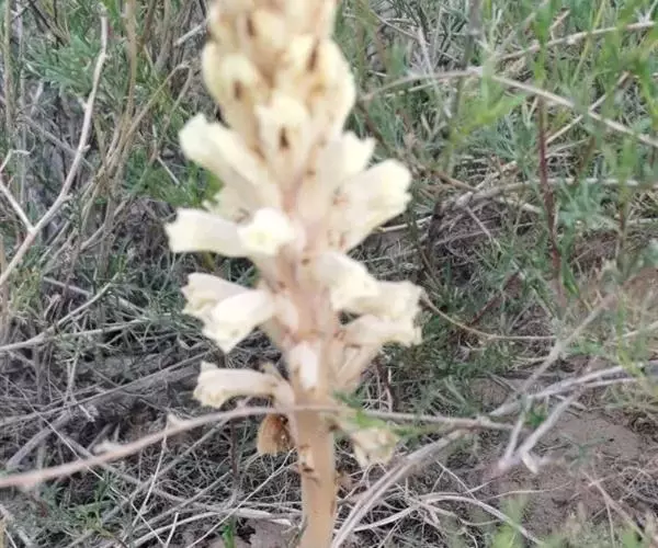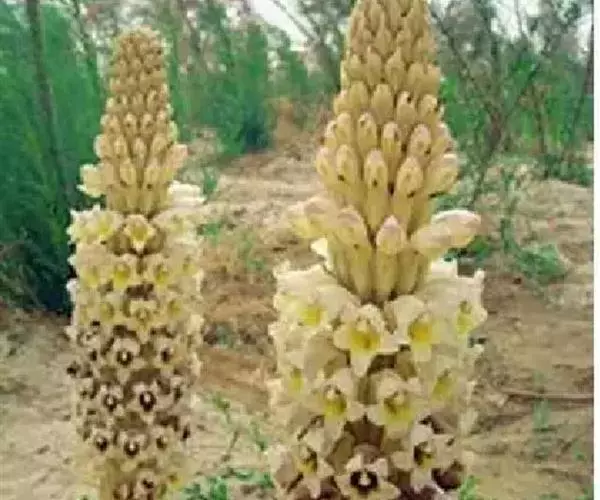 【特征】: 一年生寄生草本。株高10-34厘米,植株密被腺毛。茎直立,常不分枝,圆柱形,基部常膨大,黄褐色。叶为鳞片状、卵状披针形。