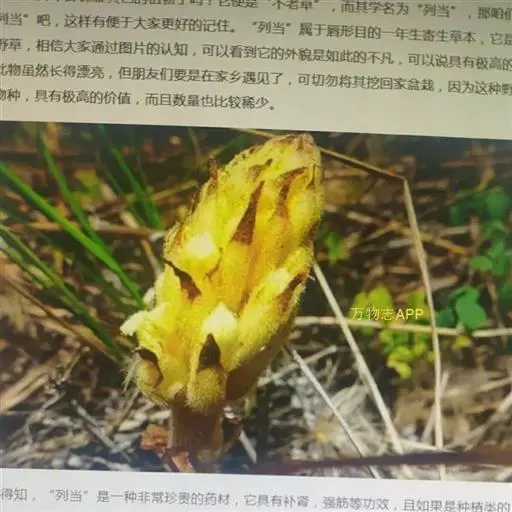 黄花列当,是双子叶植物纲二年生或多年生草本,株高10-40(-50)厘米,全株密被腺毛。茎不分枝,直立,基部稍膨大。