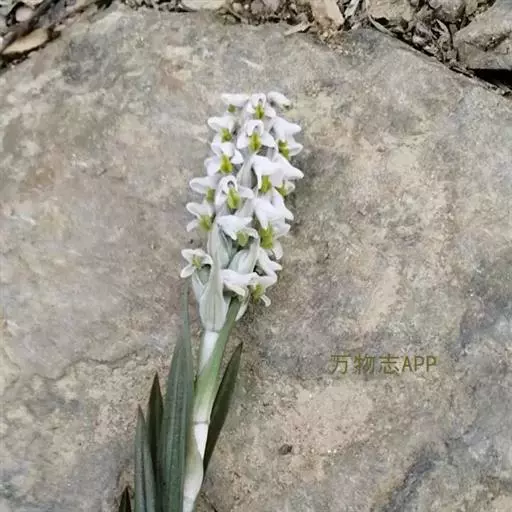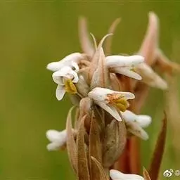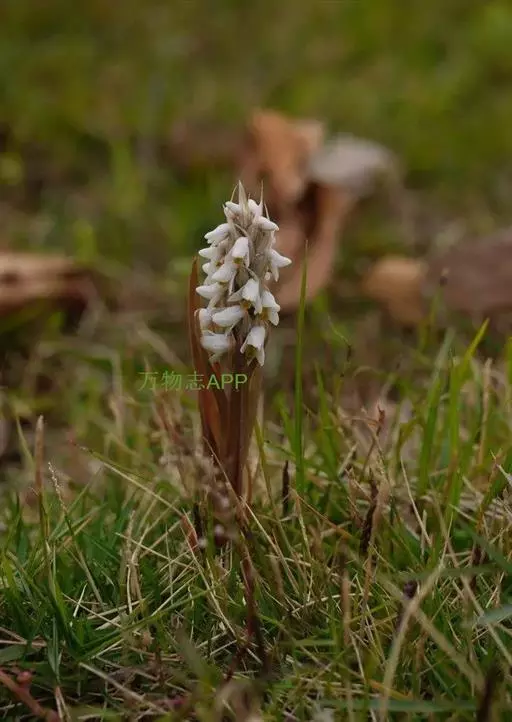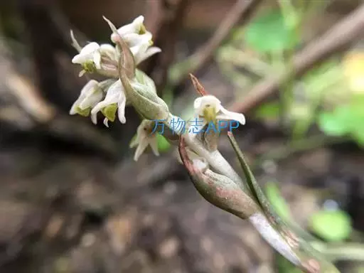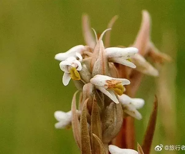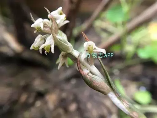 总状花序几乎无花序梗,具几朵至20余朵密生的花,长2-5厘米,花序轴无毛或有毛;花苞片卵状披针形,红褐色,长8-12毫米,先端长渐尖,长于花,背面无毛或有毛;子房椭圆状圆柱形,扭转,无毛或有毛,连花梗长5-6毫米;花小,白色或黄白色;萼片背面无毛或有毛;中萼片狭卵状长圆形,凹陷,长4-5.5毫米,宽2-2.5毫米,先端钝,具1脉,与花瓣粘合呈兜状;侧萼片偏斜的长圆形,长4-5毫米,宽1.8-2毫米,先端急尖,具1脉。