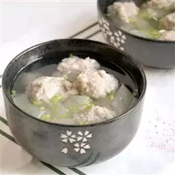 1.瘦肉及肥肉一同剁烂,加入调味料搅至起胶状,分别做成小肉丸;
