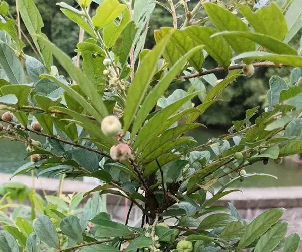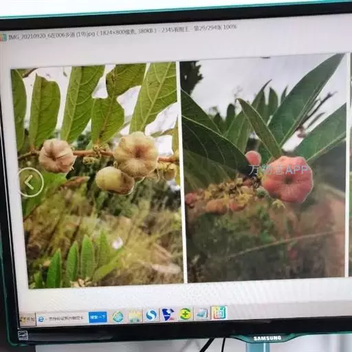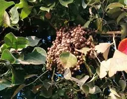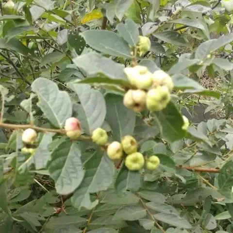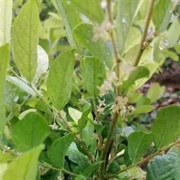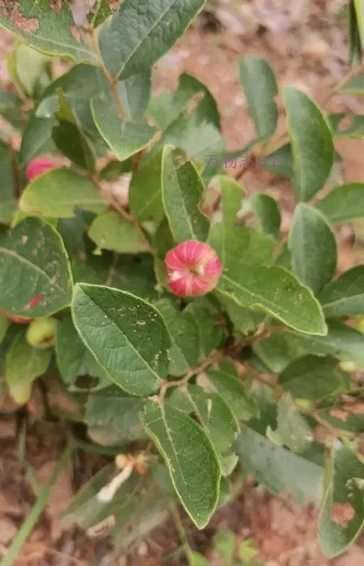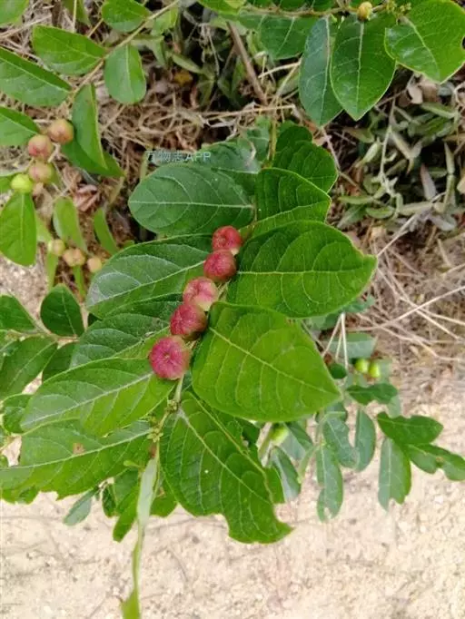算盘子,又名橘子草、蝉子树、西瓜树、果合草、血泡木。直立灌木,高1-5米,多分枝;小枝灰褐色;小枝、叶片下面、萼片外面、子房和果实均密被短柔毛。叶片纸质或近革质,长圆形、长卵形或倒卵状长圆形,稀披针形,长3-8厘米,宽1-2.5厘米,顶端钝、急尖、短渐尖或圆,基部楔形至钝,上面灰绿色,仅中脉被疏短柔毛或几无毛,下面粉绿色;侧脉每边5-7条,下面凸起,网脉明显;叶柄长1-3毫米;托叶三角形,长约1毫米。花小,雌雄同株或异株,2-5朵簇生于叶腋内,雄花束常着生于小枝下部,雌花束则在上部,或有时雌花和雄花同生于一叶腋内;雄花花梗长4-15毫米;萼片6,狭长圆形或长圆状倒卵形,长2.5-3.5毫米;雄蕊3,合生呈圆柱状;雌花花梗长约1毫米;萼片6,与雄花的相似,但较短而厚;子房圆球状,5-10室,每室有2颗胚珠,花柱合生呈环状,长宽与子房几相等,与子房接连处缢缩。蒴果扁球状,直径8-15毫米,边缘有8-10条纵沟,成熟时带红色,顶端具有环状而稍伸长的宿存花柱,种子近肾形,具三棱,长约4毫米,朱红色。花期4-8月,果期7-11月。
