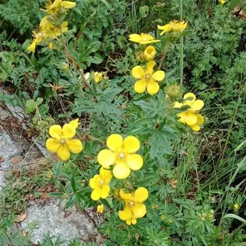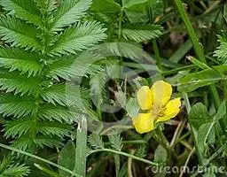 委陵菜(学名:Potentilla chinensis Ser.):多年生草本。根粗壮,圆柱形,稍木质化。花茎直立或上升,高20-70厘米,叶为羽状复叶,有小叶茎生叶托叶草质,绿色,边缘锐裂。伞房状聚伞花序,萼片三角卵形,花瓣黄色,宽倒卵形,顶端微凹,比萼片稍长;花柱近顶生。瘦果卵球形,深褐色,有明显皱纹。花果期4-10月。