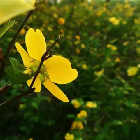 伞房状聚伞花序,花梗长0.5-16厘米,基部有披针形苞片,外面密被短柔毛;花直径通常0.8-1厘米,稀达1.3厘米;萼片三角卵形,顶端急尖,副萼片带形或披针形,顶端尖,比萼片短约1倍且狭窄,外面被短柔毛及少数绢状柔毛;花瓣黄色,宽倒卵形,顶端微凹,比萼片稍长;花柱近顶生,基部微扩大,稍有乳头或不明显,柱头扩大。