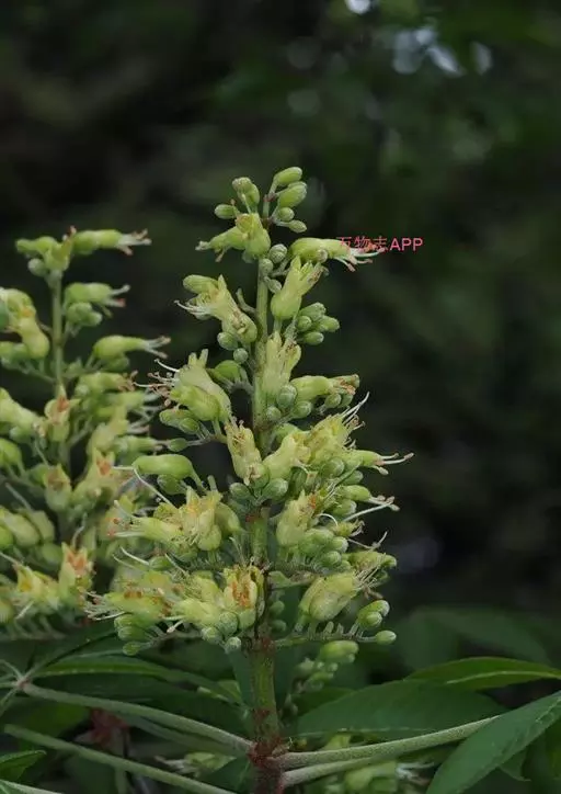 落叶乔木,高6-12米,宽度同高度几等,圆形树冠。树皮灰色,皱裂、小块裂或鳞片状裂。小枝粗壮,枝、叶搓碎后有臭昧。顶芽比侧芽大,有褐色鳞片包裹。直根发达。掌状复叶对生,5小叶,也有7小叶,小叶椭圆形或卵形,长7.5-15厘米,宽2.5-5.5厘米,具细锯齿,叶柄长7.5-15厘米。圆锥花序顶生,长10-17.5厘米,花萼橙色,花瓣黄绿色,花期4-5月。新果倒宽卵形,长2.5-5厘米,散生小刺,10月成熟,种子有毒。