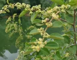 花无梗,黄色,有芳香,通常2-数个簇生排成顶生或腋生疏散穗状或圆锥状穗状花序;花序轴长2-5厘米,被绒毛或密短柔毛;花萼外面被疏柔毛;萼片三角形或三角状卵形,长约1毫米;花瓣匙形,顶端2浅裂,常内卷,短于萼片;花柱极短,柱头3浅裂,子房3室,每室具1胚珠。核果近圆球形,直径约5毫米,成熟时黑色或紫黑色,具1-3分核,味酸;种子扁平,二端微凹。花期7-11月,果期翌年3-5月。