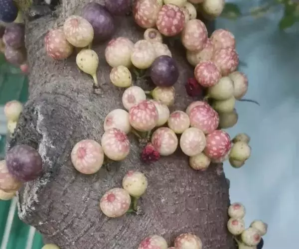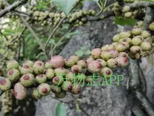 榕果单生或成对或簇生于叶腋或生无叶枝上,扁球形,直径5-8毫米,成熟时紫黑色,顶部微下陷,基生苞片3,宽卵圆形,革质;总梗长3-4毫米;雄花、瘿花、雌花生于同一榕果内;雄花很少,生内壁近口部,无梗,花被片3,宽卵形,雄蕊1枚,花药卵圆形,花丝短;雌花无柄或有柄,花被片3,披针形,花柱短,侧生,柱头圆形;瘿花多数,与雌花相似,仅子房有粗长的柄,柱头线形。花期4-6月。