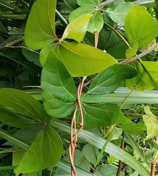 落叶木质藤本,长达到10余米。藤径粗达9厘米,全株无毛;当年枝条暗红色,老树皮有时纵裂。三出复叶,或兼具单叶,稀全部为单叶;叶柄长与3-12厘米;小叶革质,顶生小叶近棱状倒卵圆形,长4-12.5厘米,宽3-9厘米,先端急尖,基部渐狭成6-15毫米的短柄,全缘,侧生小叶斜卵形,先端急尖,基部内面楔形,外面截形或圆形,上面绿色,下面淡绿色,干时常变为红褐色,比顶生小叶略大,无小叶柄。