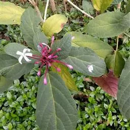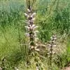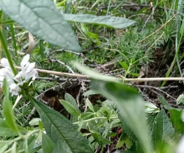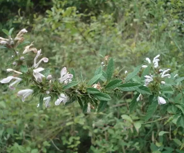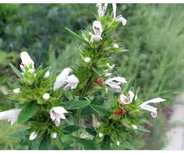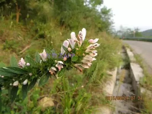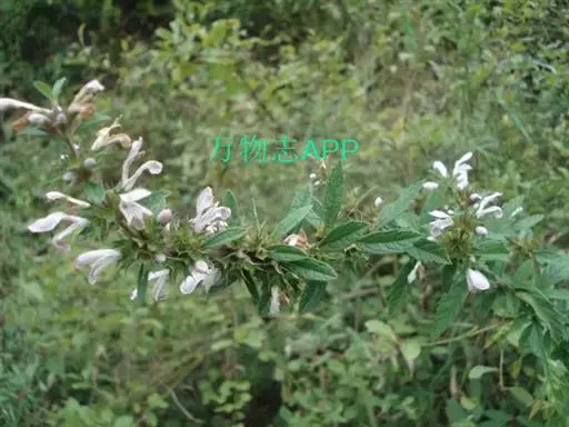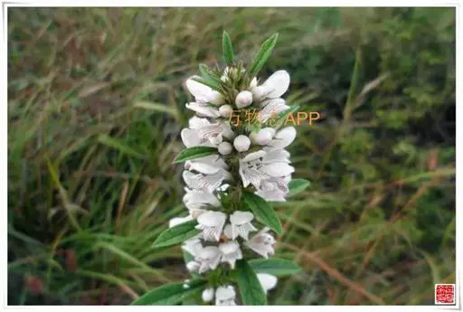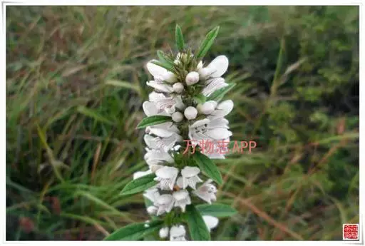 轮伞花序腋生,多花,远离而向顶密集组成长穗状;小苞片少数,刺状,直伸,长5-6毫米,基部相连接,具糙硬毛,绿色;花梗无。 花萼管状,长7-8毫米,外面被微硬毛,沿脉上被长硬毛,其间混有淡黄色腺点,中部以上均绿色,中部以下渐近基部毛被疏少而呈草黄色,内面无毛,脉5,除近基部外明显突出,齿5,前2齿靠合,较大,长5毫米,直伸,钻状,先端刺尖,后3齿较小,均等大,长3毫米,直伸,三角状钻形,先端刺尖。 花冠白色,常带紫纹,长1.8厘米,冠筒长约8毫米,外面在中部以下无毛,中部以上被疏柔毛,内面在上部被短柔毛,中部具近水平向的鳞状毛毛环,其下方无毛,冠檐二唇形,上唇长圆状卵形,先端近圆形,基部略收缩,长达1厘米,直伸,稍内凹,全缘,白色,外被疏柔毛,内面无毛,下唇轮廓为卵形,长约8毫米,宽约5毫米,白色,具紫纹,3裂,外被疏柔毛,内面无毛,中裂片较大,倒心形,先端微凹,明显2小裂,侧裂片卵圆形。 雄蕊4,均延伸至上唇片之下,前对较长,花丝丝状,扁平,具紫斑,中部以下或近基部有微柔毛,花药卵圆形,2室。花柱丝状,先端相等2浅裂。花盘平顶。子房褐色,无毛。