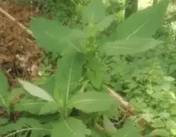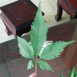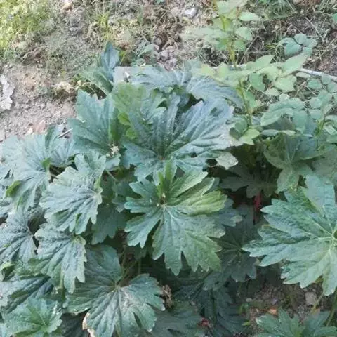 叶片变异很大,最下部的叶通常脱落,近茎基部叶轮廓为卵圆形,长6-7厘米,宽4-5厘米,3裂,分裂达中部,裂片几相等,边缘疏生粗锯齿状牙齿,先端锐尖,基部宽楔形,近革质,上面暗绿色,稍密被糙伏小硬毛,粗糙,叶脉下陷,具皱纹,下面淡绿色,主沿脉上有贴生的小硬毛,其间散布淡黄色腺点,叶脉明显凸起,叶柄长1-2厘米,多少具狭翅,腹面具槽,背面圆形,密被小硬毛;茎中部的叶通常不裂,轮廓为长圆形,边缘疏生4-5对齿,最下方的一对齿多少呈半裂片状,其余均为锯齿状牙齿,叶柄较短,长在1厘米以下;花序上的苞叶最小,近于线状长圆形,长3厘米,宽1厘米,全缘,或于先端疏生1-2齿,无柄。