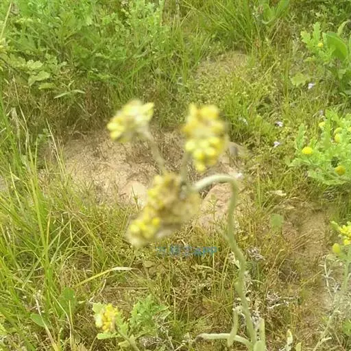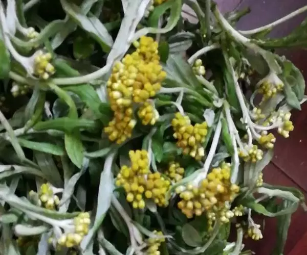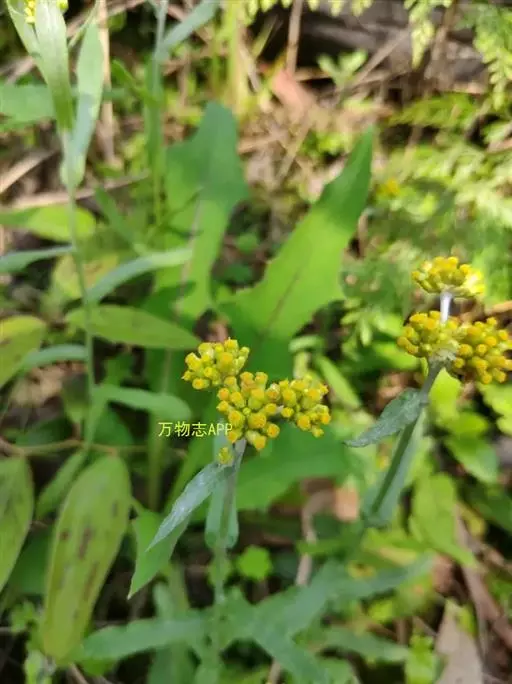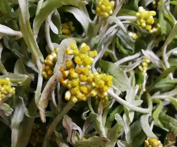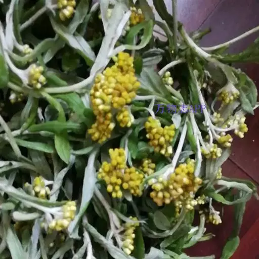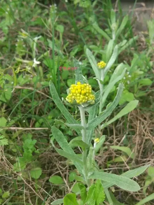 一年生草本。茎直立或基部发出的枝下部斜升,高10-40厘米或更高,基部径约3毫米,上部不分枝,有沟纹,被白色厚棉毛,节间长8-20毫米,上部节间罕有达5厘米。叶无柄,匙状倒披针形或倒卵状匙形互生,长5-7厘米,宽11-14毫米,上部叶长15-20毫米,宽2-5毫米,基部渐狭,稍下延,顶端圆,具刺尖头,两面被白色棉毛,上面常较薄,叶脉1条,在下面不明显。头状花序较多或较少数,径2-3毫米,近无柄,在枝顶密集成伞房花序,花黄色至淡黄色;总苞钟形,径约2-3毫米;总苞片2-3层,金黄色或柠檬黄色,膜质,有光泽,外层倒卵形或匙状倒卵形,背面基部被棉毛,顶端圆,基部渐狭,长约2毫米,内层长匙形,背面通常无毛,顶端钝,长2.5-3毫米;花托中央稍凹入,无毛。雌花多数,花冠细管状,长约2毫米,花冠顶端扩大,3齿裂,裂片无毛。两性花较少,管状,长约3毫米,向上渐扩大,檐部5浅裂,裂片三角状渐尖,无毛。瘦果倒卵形或倒卵状圆柱形,长约0.5毫米,有乳头状突起。冠毛粗糙,污白色,易脱落,长约1.5毫米,基部联合成2束。花期1-4月,8-11月。